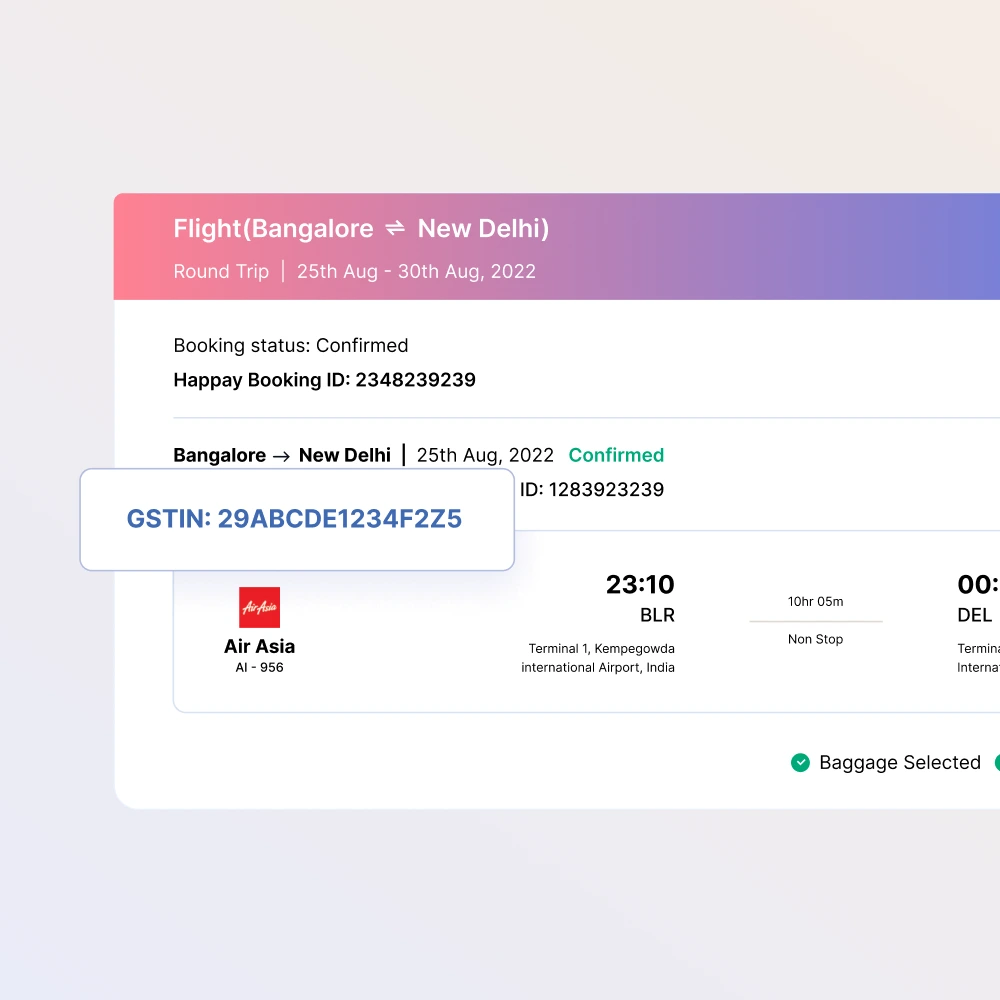 - Input GST details and employee codes once, and Happay will automatically add the correct GSTIN when employees book flights and hotels, minimizing errors