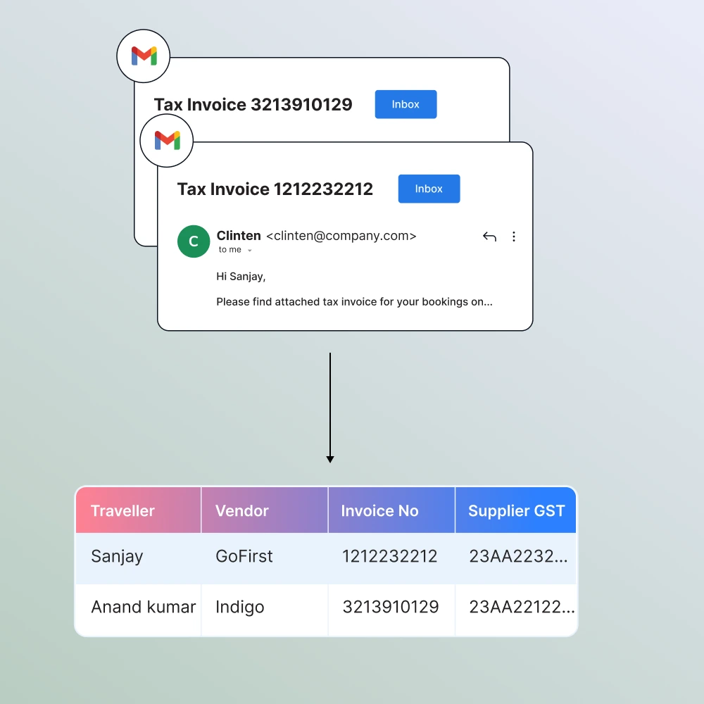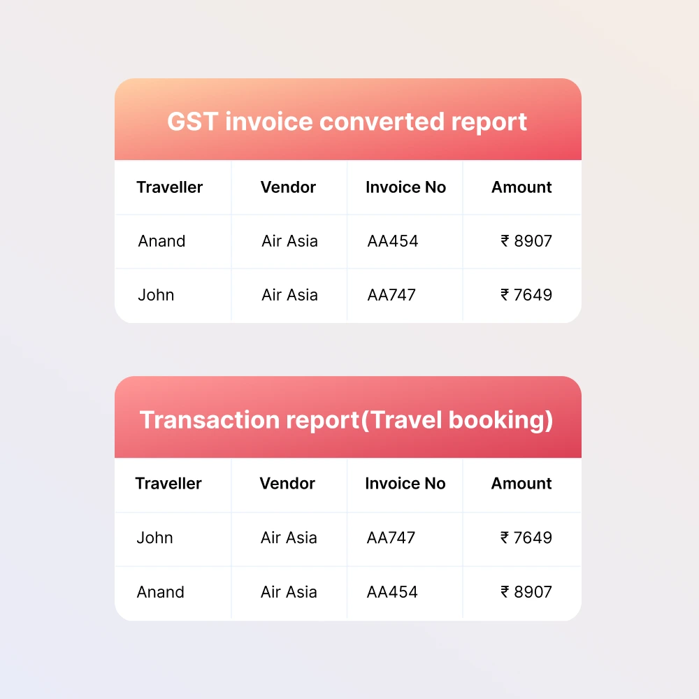 - Our solution provides consolidated GST invoices with traveler details in a single click, drastically reducing the effort required for flight expense reconciliation by 90%