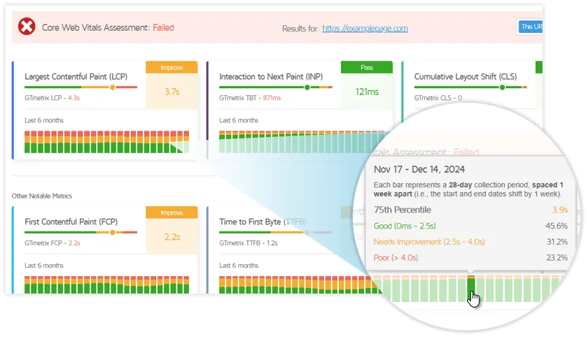 GTmetrix is a web-based service for testing and monitoring website performance that generates Lighthouse-based metrics, grades, and structured audits, enriched with real-user Chrome UX Report (CrUX) data where available. It offers global test locations, mobile emulation, connection throttling, video capture, and detailed waterfalls to diagnose load sequencing, slow or broken requests, and third-party impacts. Monitoring schedules with alerting and historical graphs enable ongoing performance tracking; GTmetrix PRO adds hourly monitoring, more locations, extended CrUX history, and advanced analysis controls such as custom DNS, user agent, and viewport settings.