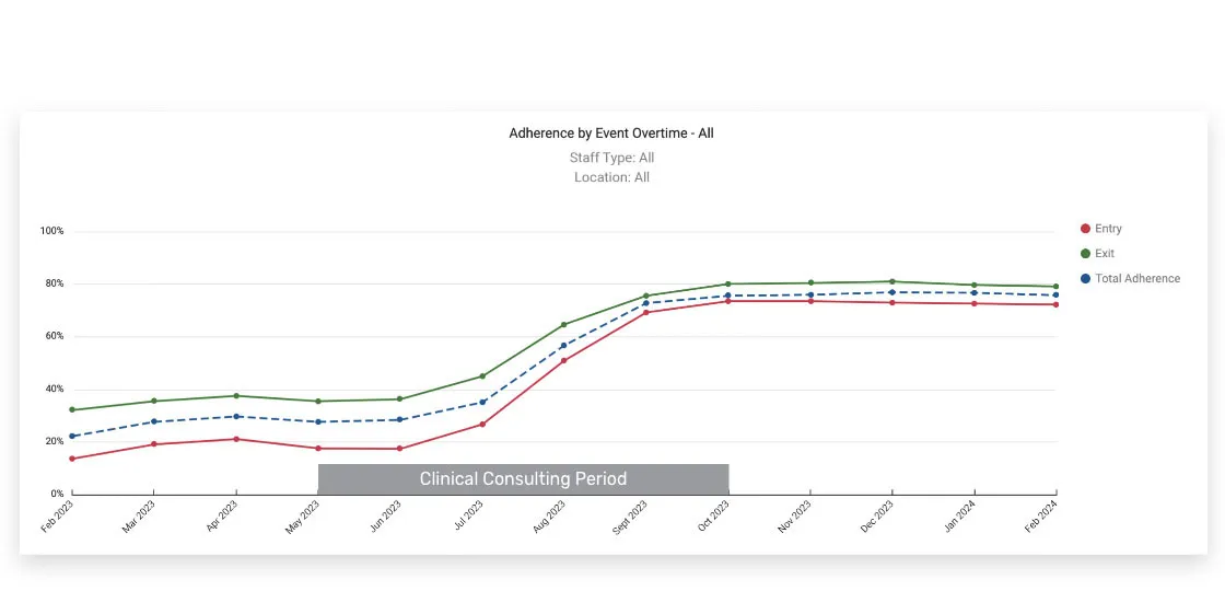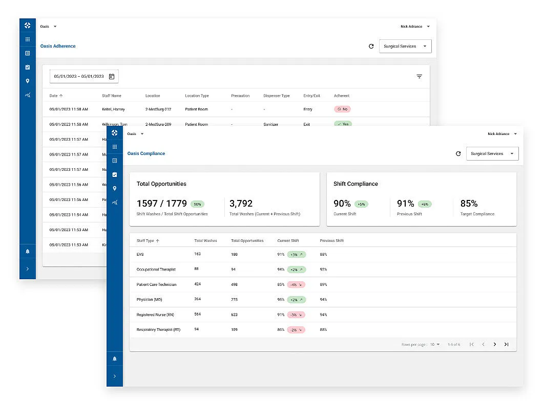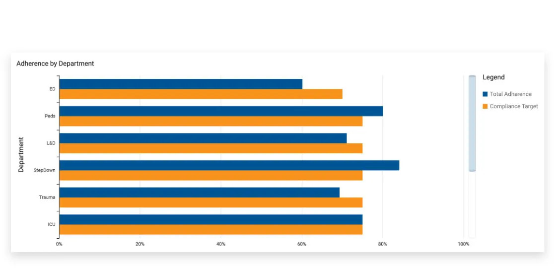 - Granular reporting: Compliance dashboards and reports can be filtered by hospital, unit, role, shift, or individual clinician to support auditing and targeted improvements.