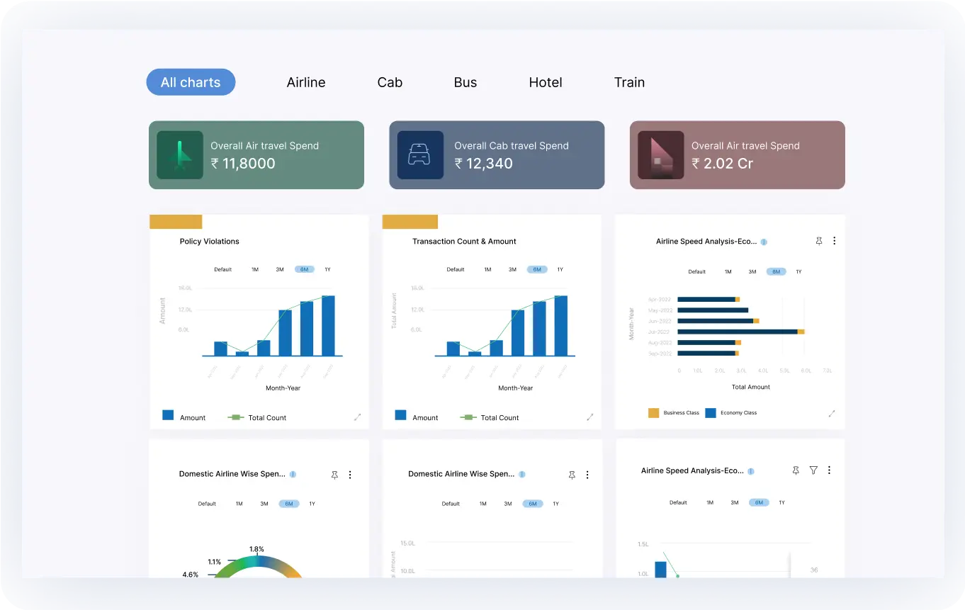 - Quick-view dashboard with segregated reports on airlines, hotels, cabs, trains, and buses.