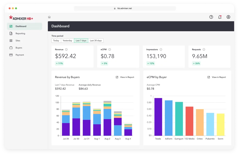 Admixer Header Bidding is a flexible, white‑label solution that enables publishers to connect multiple demand sources simultaneously, increasing competition and maximizing yield. It supports both client‑side and server‑side header bidding, offers streamlined integration across web and in‑app environments, and provides advanced analytics for optimizing auctions.