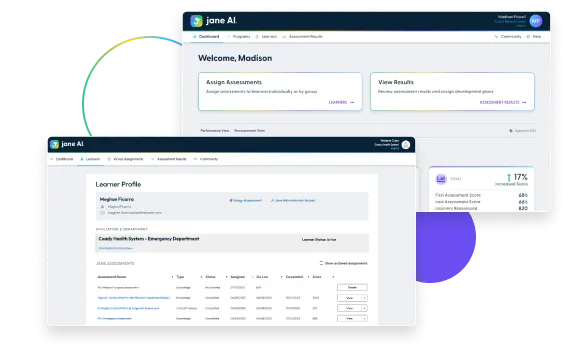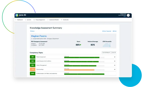 Focus learning based on where the learner has opportunity to improve competence. Following the completion of assessments, jane analyzes where there is opportunity for improvement, and curates a recommended learning plan to develop the individual based on gaps in knowledge and clinical judgment.