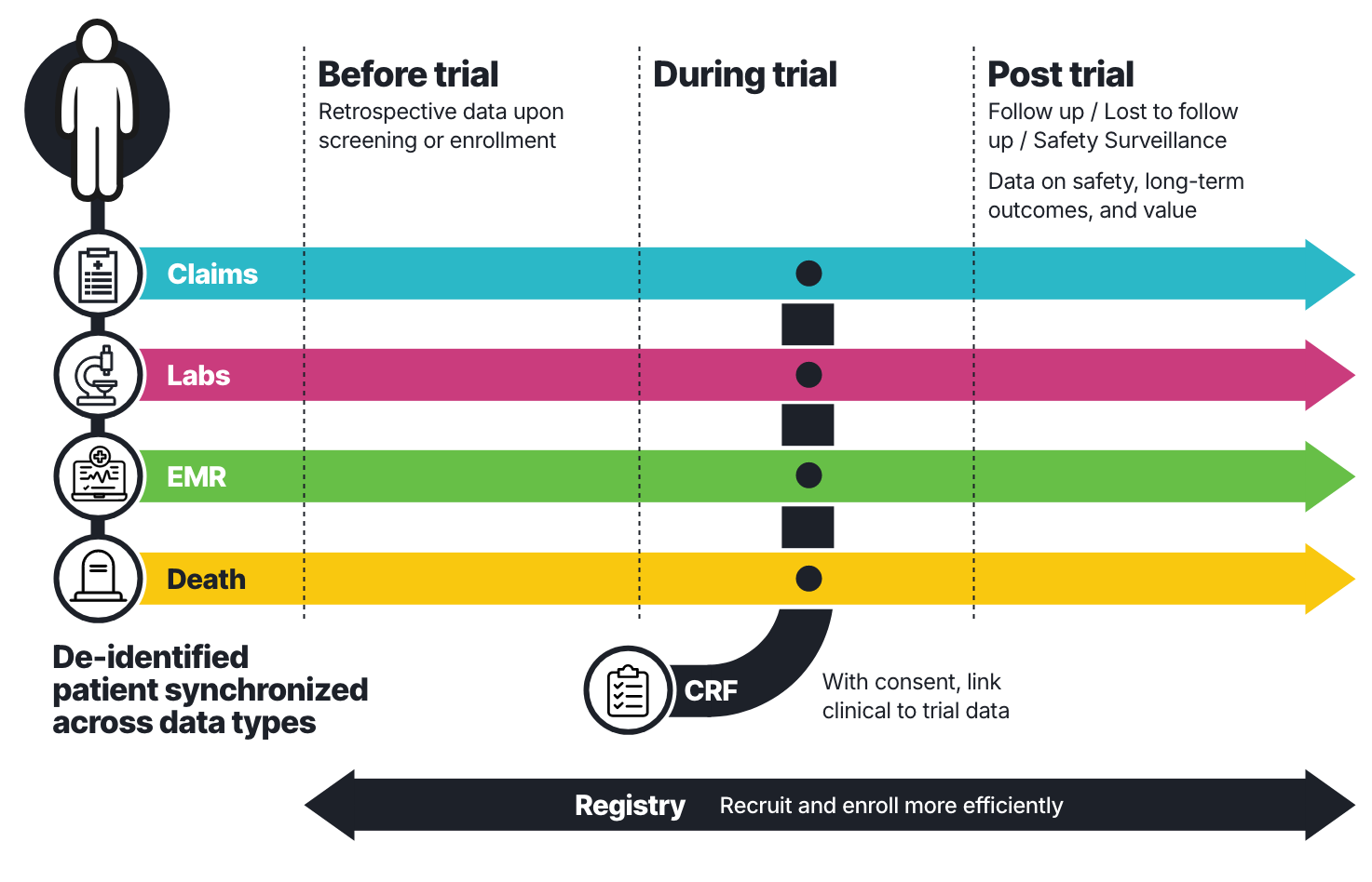 - End-to-end synchronization of patient journeys across clinical trials and RWD