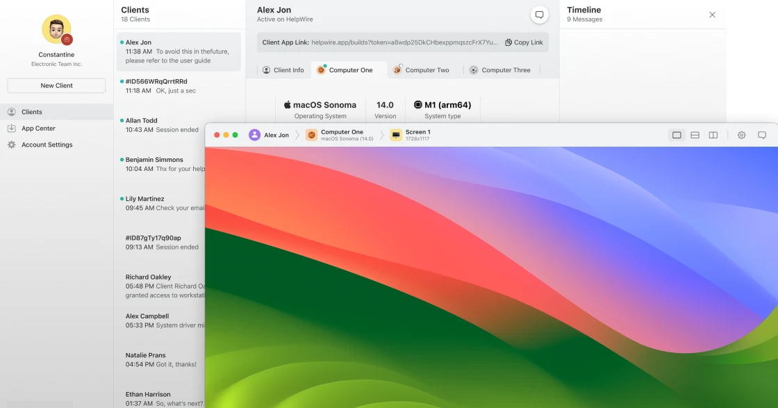 HelpWire is a remote support service that enables operators to connect to and control remote computers for technical assistance. It is designed for both attended and unattended access scenarios and operates across Windows, macOS, and Linux systems. The service focuses on quick session setup, minimal client configuration, and centralized management of remote connections. All remote sessions are initiated through user permission or pre‑approved unattended access, making it suitable for professional IT support, maintenance, and troubleshooting tasks.