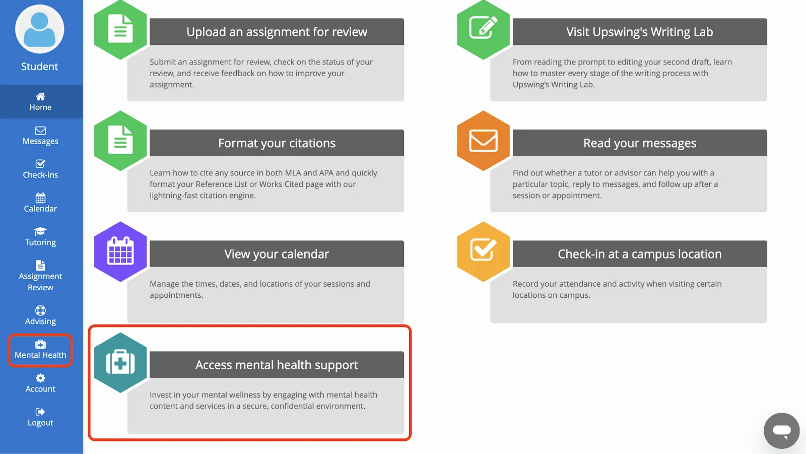 Upswing’s holistic student support platform centralizes academic tutoring, mental health services, advising, and basic needs assistance into one accessible system. It empowers colleges to improve retention by delivering timely, personalized support to diverse student populations through proactive messaging, teletherapy, assignment review, and real-time engagement tools.