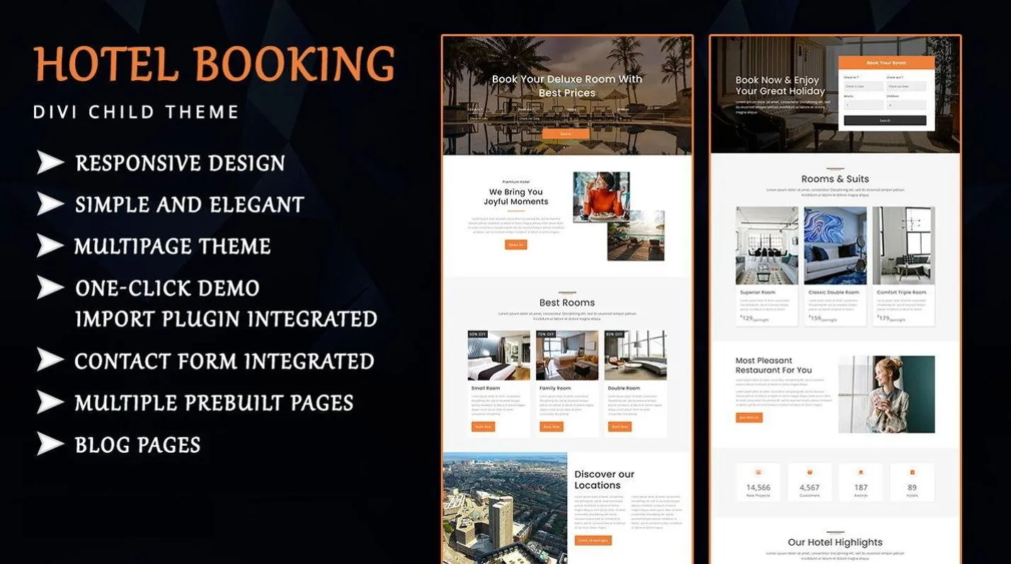 Hotel Booking is modern and elegant Multi Page Divi Child Theme which is suitable for hotels, hotel booking, travels, tours, resorts, beach villas, booking categories.