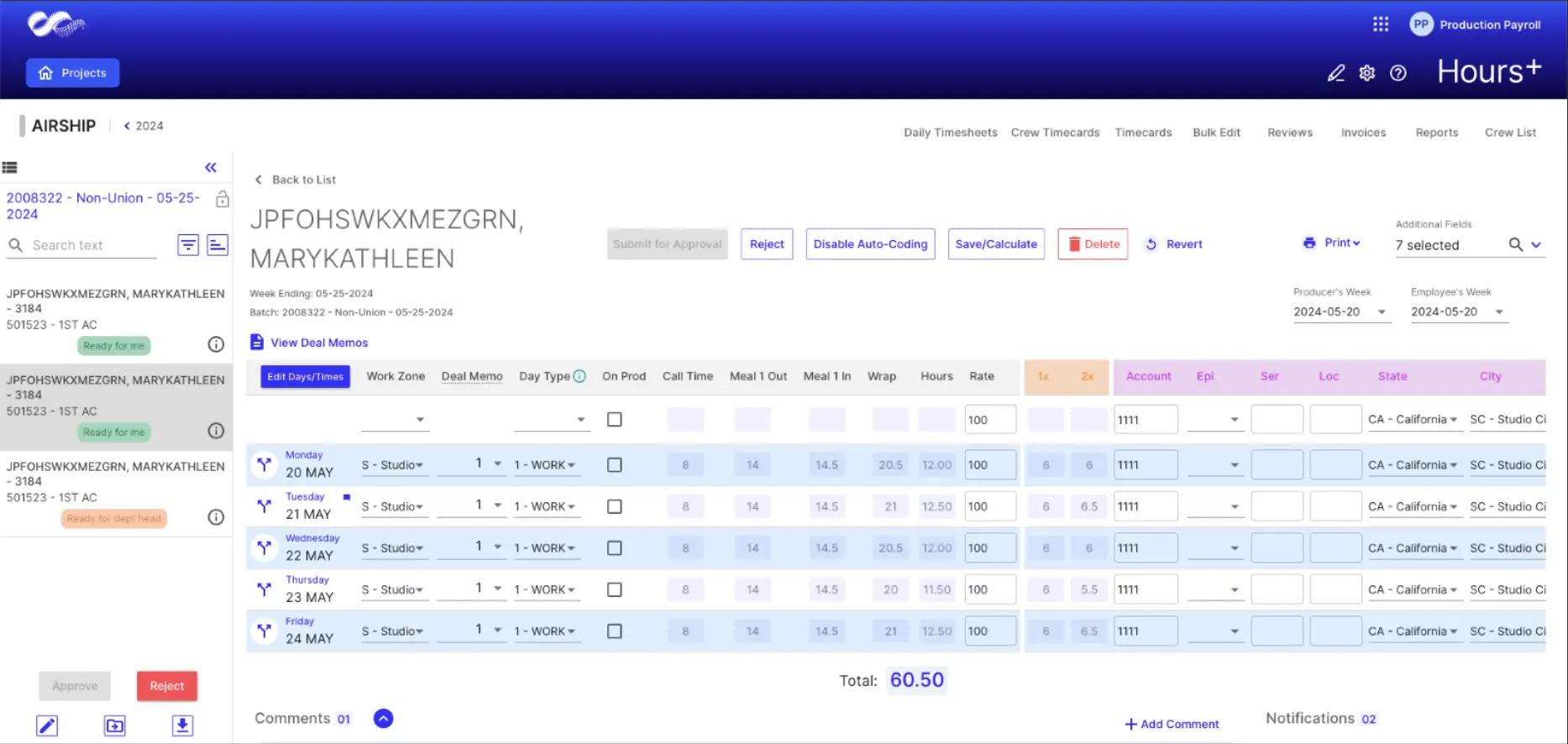 Convenient Enables your crew to digitally submit their timecards from any device. No more having to track people down. Automated Calculated timecard data based on union contracts is digitally delivered to supervisors/approvers, then back to us for processing. Immediate Production accountants have instant access to crew timecards and visibility of hours-to-gross pay. Efficient Simplified bulk approvals process reduces human error and improves accuracy. Customizable Create your own custom batches and approval chains to configure your approval flow however you’d like. Accurate Enjoy enhanced hours-to-gross visibility with calculations to ensure accuracy. Targeted Robust customizable triggers allow you to auto-code based on set criteria like state tax, meal penalties, and overtime.