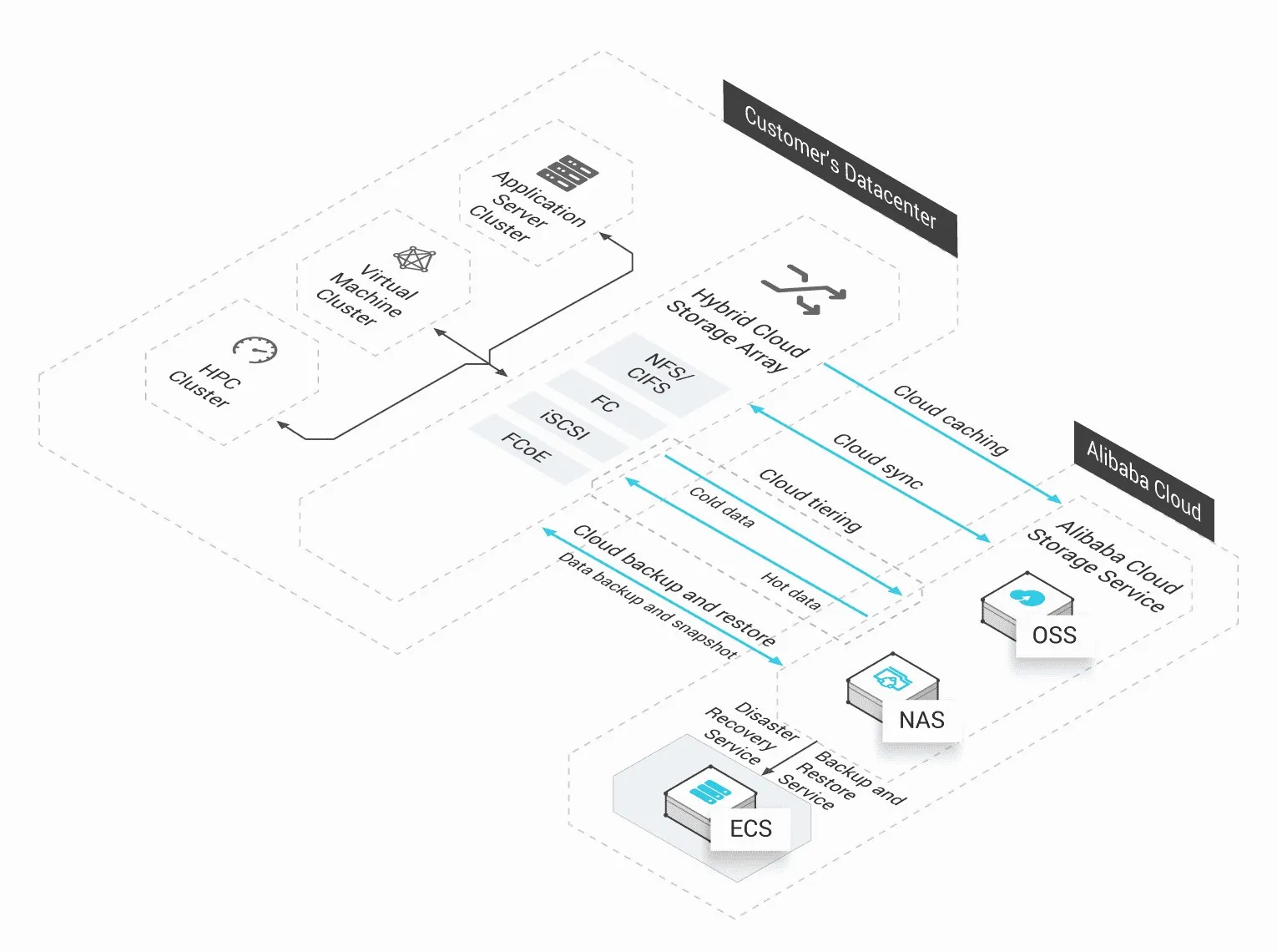 Hybrid Cloud Storage is an enterprise-level storage array that integrates with the Alibaba Cloud storage gateway. HCSA services provide a cost-effective, efficient and easy-to-manage hybrid cloud storage solution.