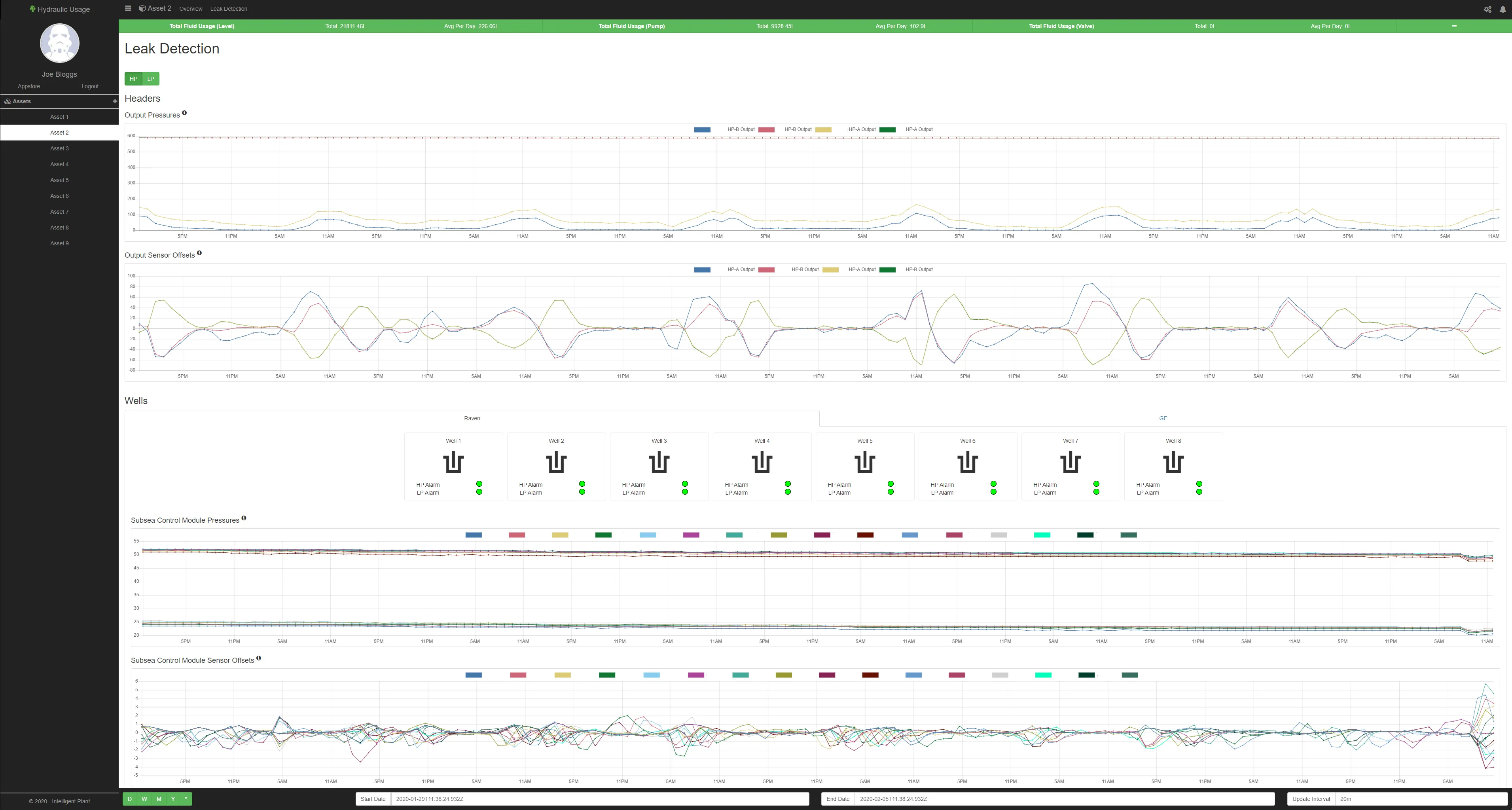 Hydraulic Usage monitors subsea hydraulic control systems by calculating and recording hydraulic fluid use over time. The application will then analyse this data and raises alarms to warn of any nascent or catastrophic fluid leakage that is occurring in the system.