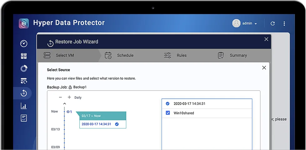 Simply add your VMware® and Hyper-V to Hyper Data Protector’s Inventory, then follow the Backup Job Wizard to create your backup tasks. You can back up all the VMs on the Hypervisor or backup individual VMs. Hyper Data Protector supports multiple version retention for up to 1,024 versions.