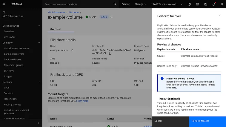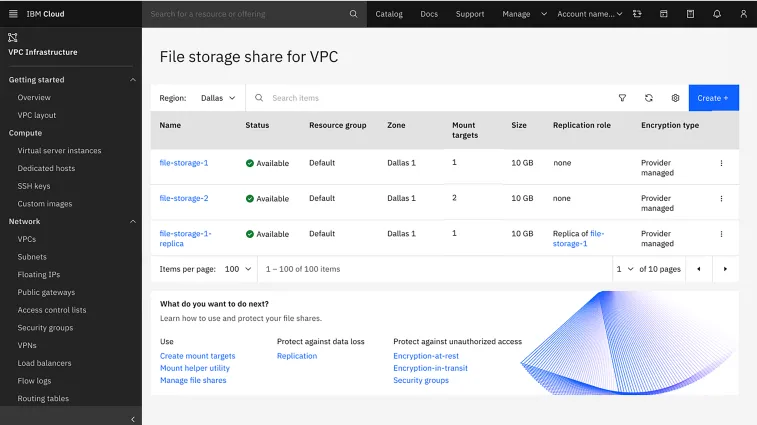 IBM Cloud File Storage for Virtual Private Cloud (VPC) provides secure, persistent, cloud NFSv4.1 file storage. This data storage allows you to create zonal file shares for IBM Cloud Virtual Servers on Virtual Private Cloud. Get total control and help minimize costs with flash-backed architecture. Create file shares from 10–32,000 GB, and provision it with a variety of flexible options to quickly adjust to changes in workload demands.