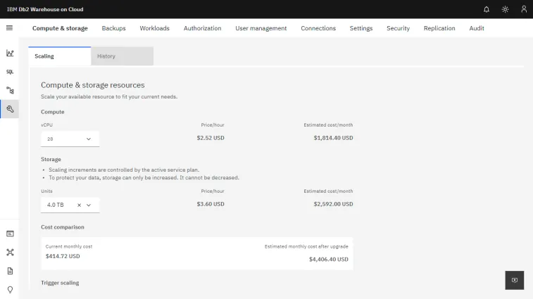 - **AI-powered workload management: **With Db2 Warehouse, you can take control of your analytics costs with elastic scale and a cloud-native architecture based on separation of storage and compute and cost-effective object storage. With AI powered workload management, you can automatically distribute resources based on your price-performance needs.