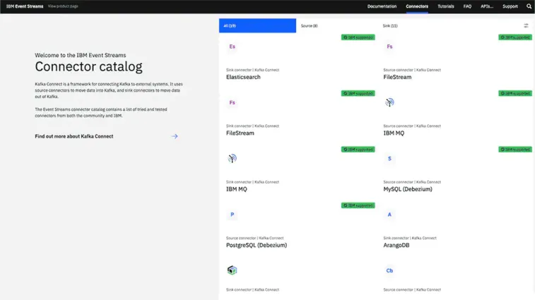 - **Kafka Connect framework: **You can use Kafka Connect with Event Streams for IBM Cloud and can choose whether to run the workers inside or outside IBM Cloud. IBM provides a list of over 50 connectors that are supported by IBM or the community.