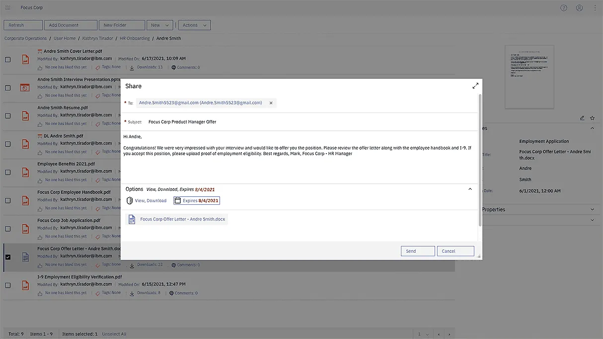 - **Securely share: **Send and collaborate on individual documents, folders and team spaces with outside parties while ensuring all security policies are upheld.