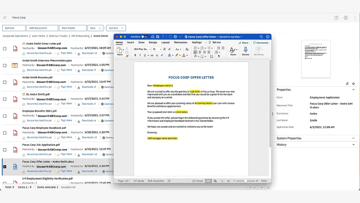 - **Salesforce integration: **Upload, index, edit, collaborate and govern essential sales or service content assets like price quotes, client emails, contracts, case files and more without switching between applications.