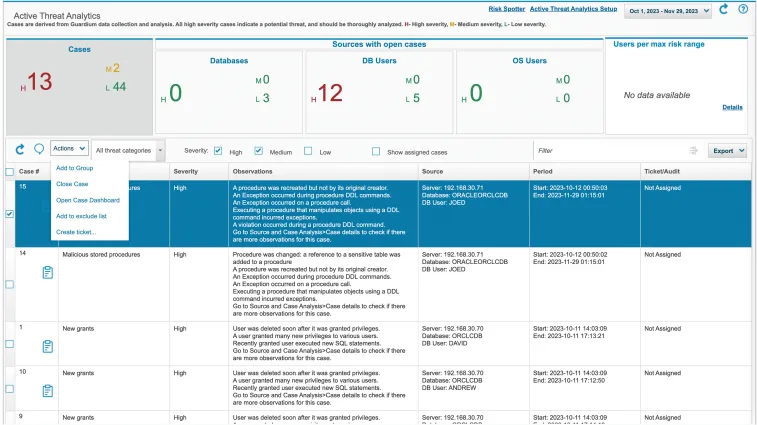 - **Active threat analytics: **The Active Threat Analytics dashboard shows potential security breach cases, based on an outlier mining process and identified attack symptoms. In this dashboard you can view and investigate cases, and also act on individual cases.