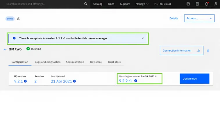 - **Easy Maintenance and Upgrades: **Leverage the latest security and functionality that IBM MQ has to offer with version upgrades at the click of a button.