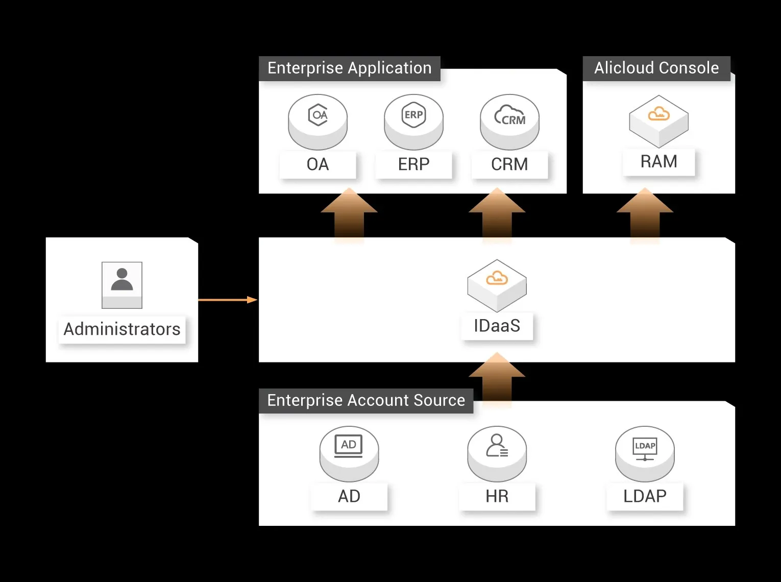 IDaaS may serve as a bridge for other cloud platform identities to be connected to Alibaba Cloud. A cloud identity management solution is usually the fundamental requirement for an enterprise to set foot in cloud services. IDaaS can bridge identities between Alibaba Cloud, private environments, and several public cloud providers.