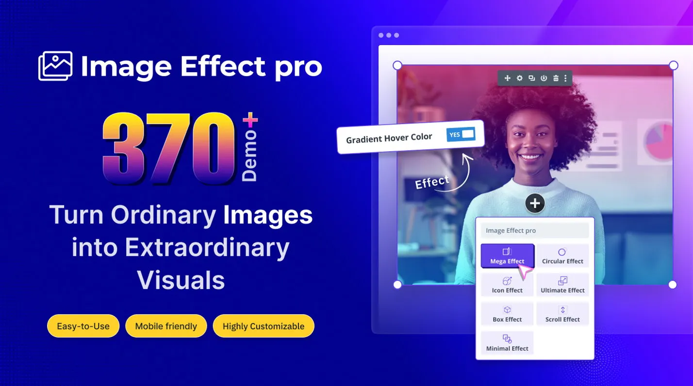 Image Effect Pro is the ultimate solution for enhancing image presentation on Divi websites. With this powerful plugin, users can effortlessly apply stunning interactive effects that will captivate your audience and boost the website’s visual appeal. While there are many image customizer plugins available, Image Effect Pro carves its own path with its tried & tested effect library, customizability, and ease of use.