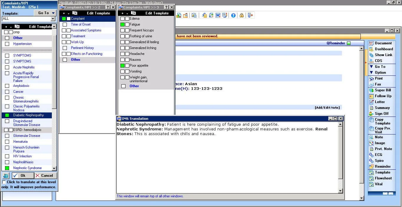 Pressured to do EHR documentation while maintaining patient face time? With Meditab, it's all about automation. Our EHR is loaded with templates for all kidney-related conditions, so you can have the system automatically fill out common data in just a few clicks. No more tedious encoding, just edit what you need to.