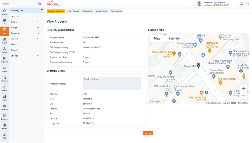 - Land Management: Captures detailed land banking information, purchase workflows, survey maps, ownership details, and transaction types.