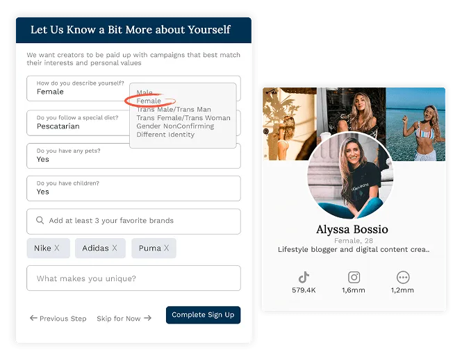 Need to survey your network? Easily engage them within the platform. First party data and insights align you and your goals with the right creators.