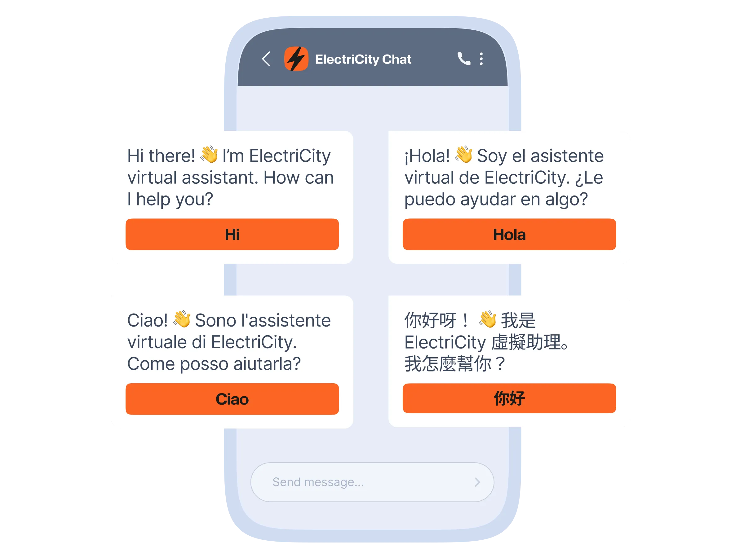 Personalize welcome and repetitive messages, including buttons and quick replies based on the customer’s language.