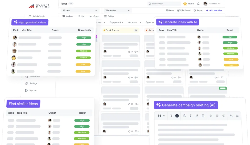 Accept Mission’s Innovation Portal is a branded, user-friendly platform where employees, partners, and customers engage in innovation activities. It supports spontaneous idea submissions, structured campaigns, and real-time collaboration, helping organizations drive participation, refine ideas, and track contributions effectively.
