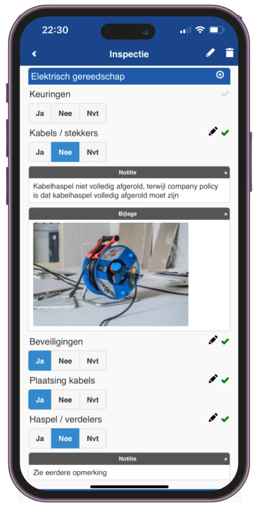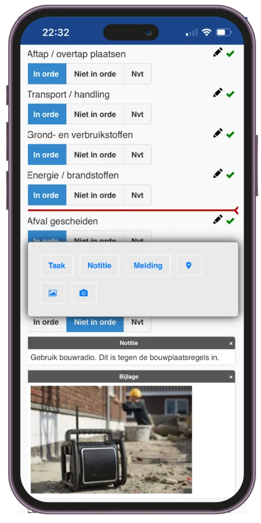 The "Inspections" module is a key component of the VeiligWerk | SafetyFirst safety management platform, designed to facilitate comprehensive inspections on projects or sites. This module supports various types of inspections, including workplace inspections, management safety walks, behavioral audits, and specific inspections like scaffolding or technical installations. Users can create their own inspection forms, add photos and comments, and assign tasks and notifications to ensure thorough follow-up on inspection findings.