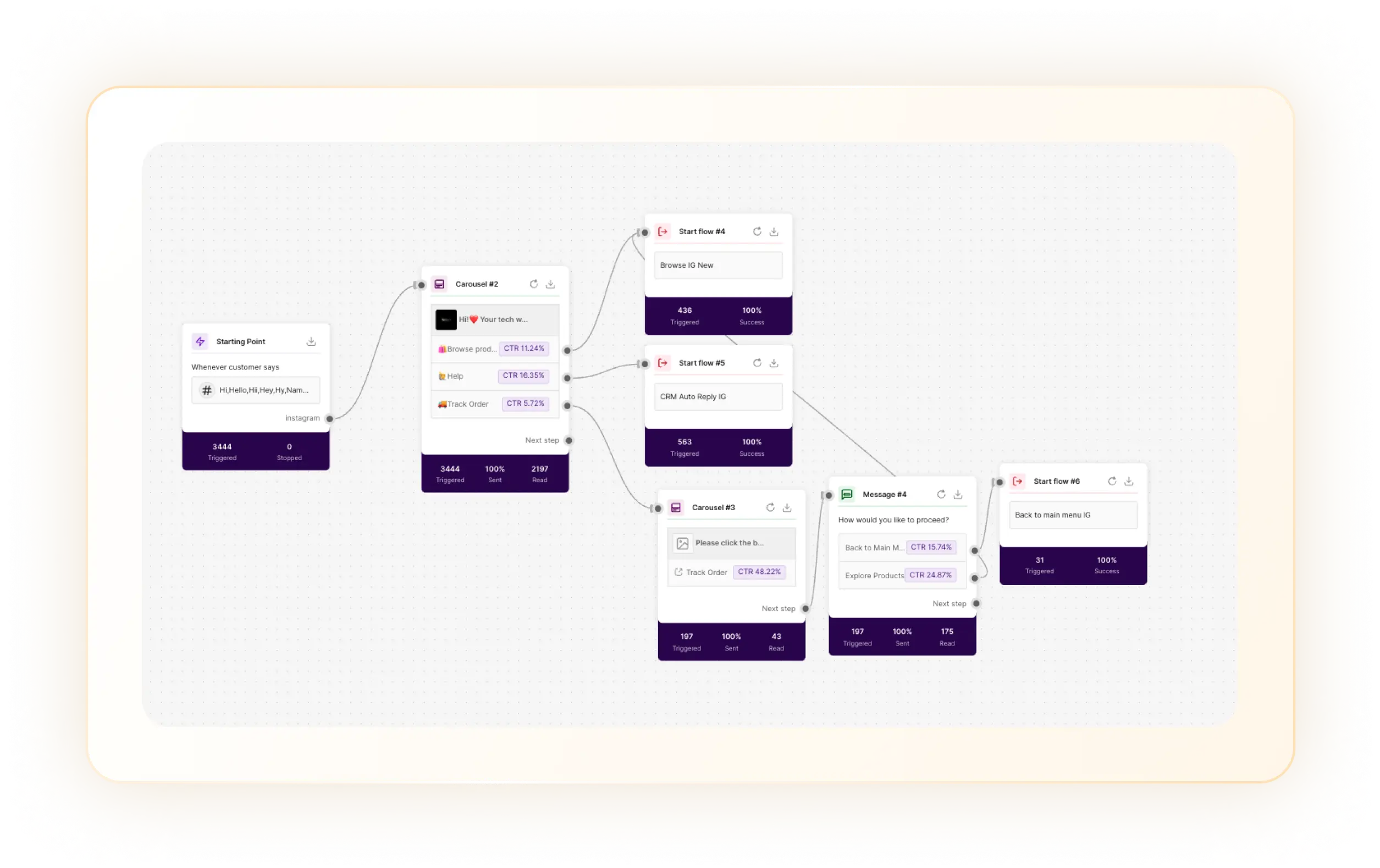 - **Journey / Flow Builder: **Visual journey builder to design multi-step conversational flows (welcome flows, qualification, cart recovery, upsell sequences) with branching and actions.