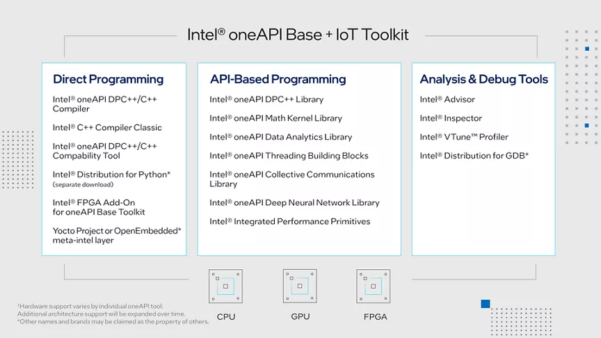 - Intel® oneAPI IoT Toolkit - Enhanced build and analysis tools and libraries help with IoT system design, development, and deployment across CPU, GPU, FPGA, and other accelerator architectures. - Enable faster integration across the software stack, optimized performance and power efficiency, and improved time to market.