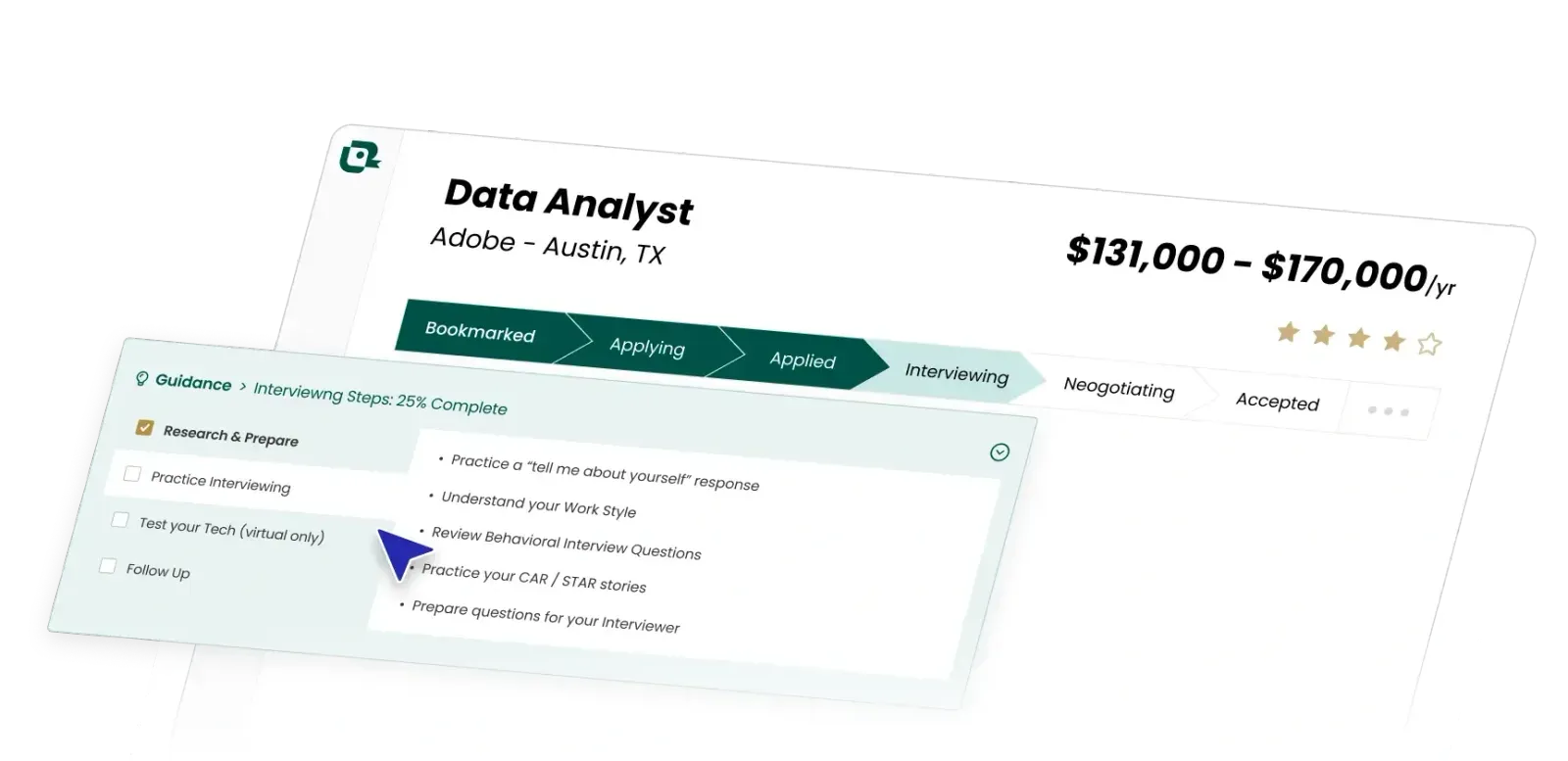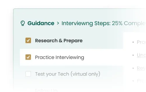 - Structured Preparation: Step-by-step tasks to complete before your interview.