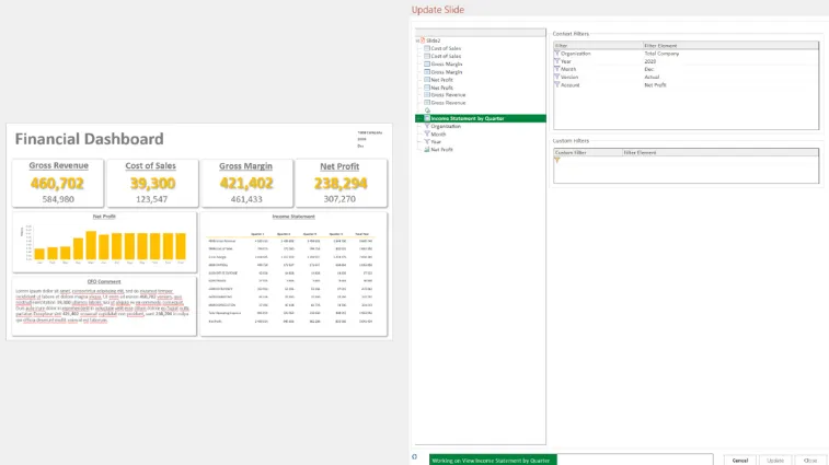 - **Integrate: **Insert your report objects and update your entire presentation via just a few mouse clicks.