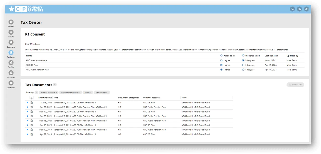 Enable and monitor electronic consent for investors to access and download K-1s and other critical tax documents through the Tax Center.