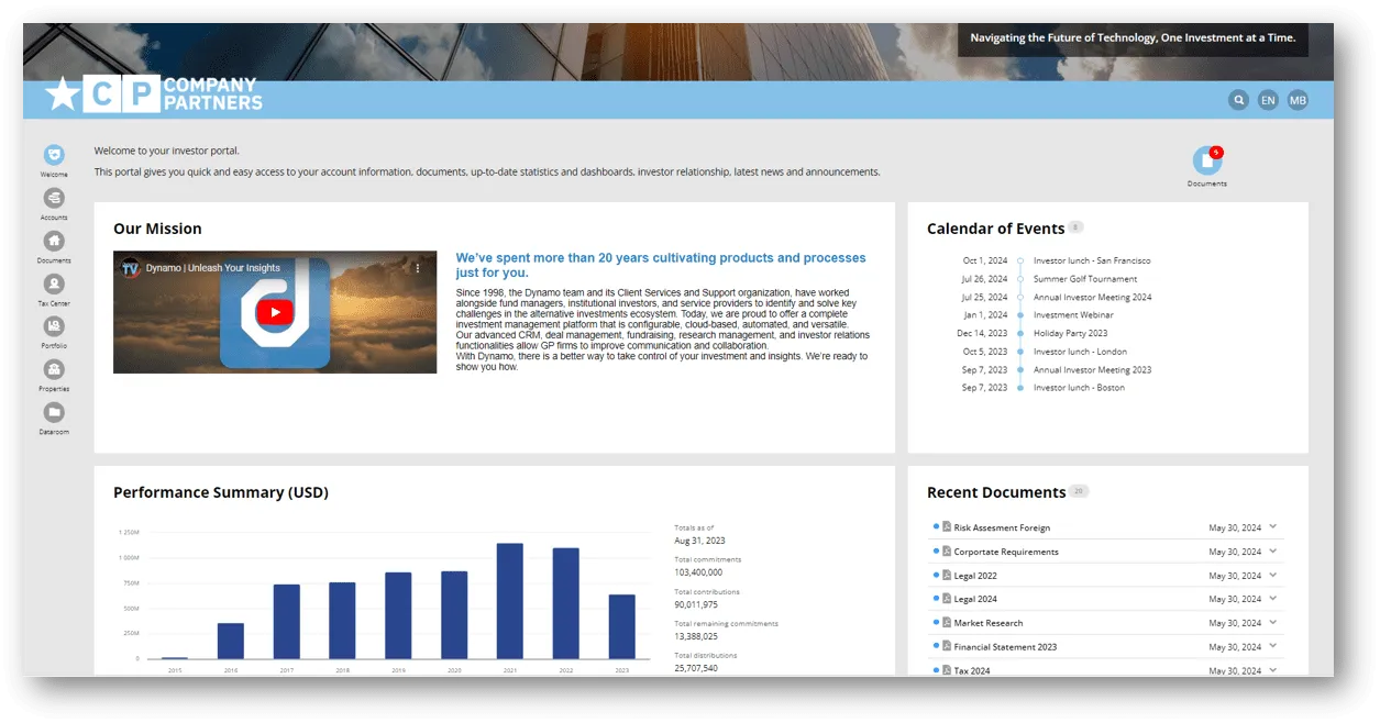 Dynamo’s new Investor Portal is a leap toward digital excellence in investor communications. By combining innovative technology with a deep understanding of the alternative investment landscape, Dynamo empowers your team to build stronger, more engaging relationships with clients, backed by an authoritative platform that you can trust. Don’t wait to see the next-generation of investor portal solutions with Dynamo.