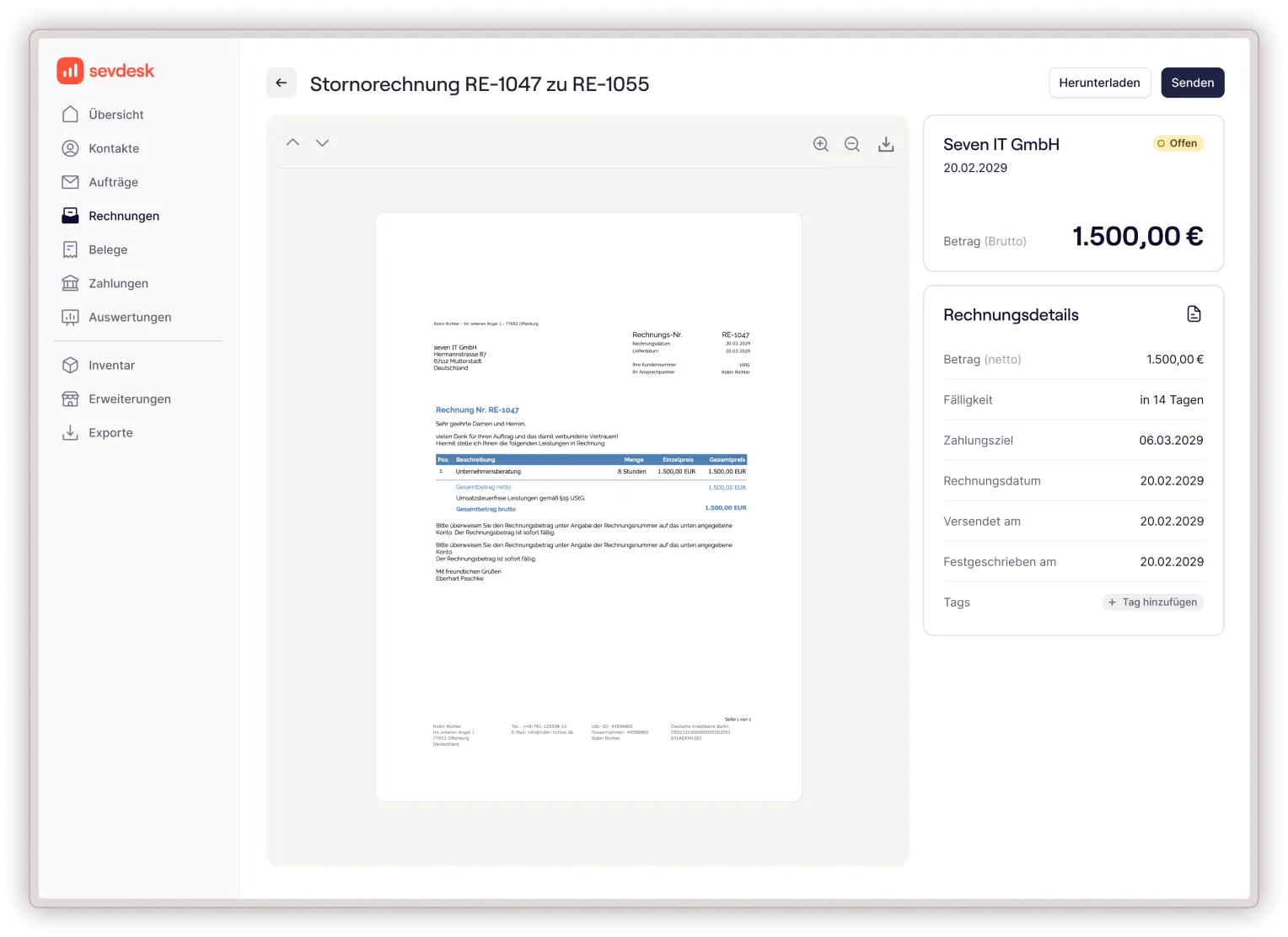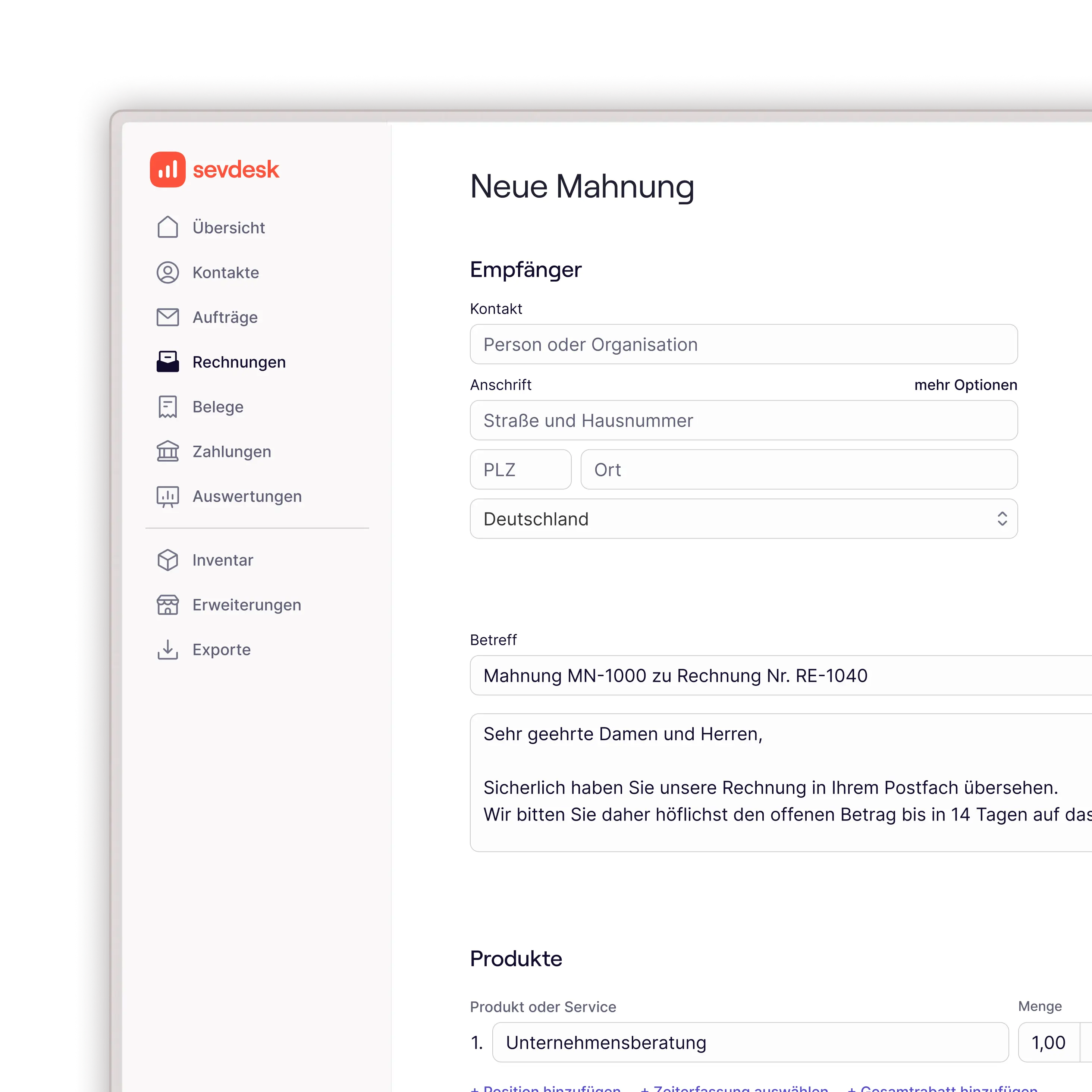 The Sevdesk online invoicing program enables freelancers and small businesses to create legally compliant invoices, quotes, and reminders quickly and efficiently. It offers customizable templates, automated invoice numbering, and flexible delivery options, helping users streamline billing processes and maintain professional financial documentation.