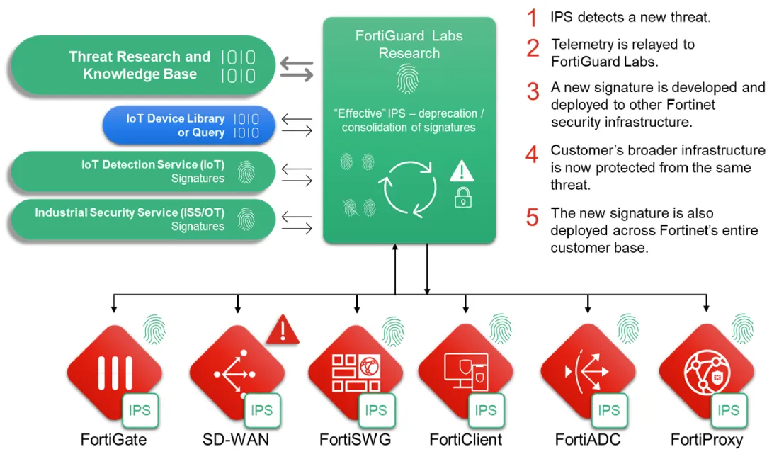 FortiGuard Intrusion Prevention Service (IPS) delivers AI/ML-powered, real-time threat intelligence with thousands of signatures to detect and block known and emerging threats, ensuring robust network security.