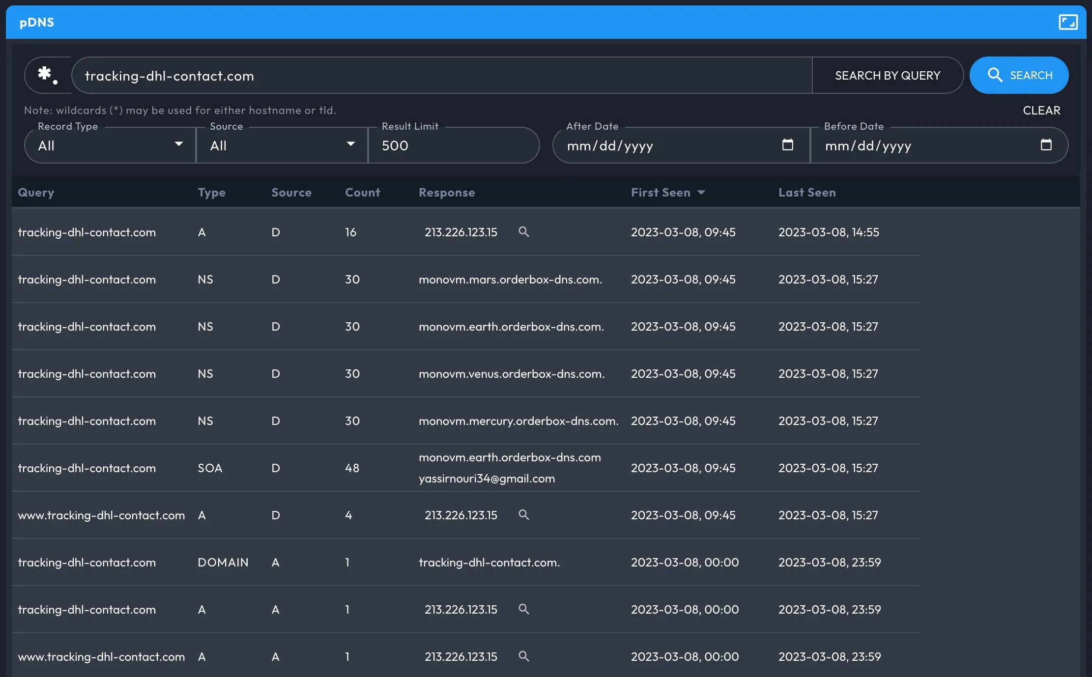 - View both historical and current infrastructure associated with a domain, utilizing extensive passive DNS records.
