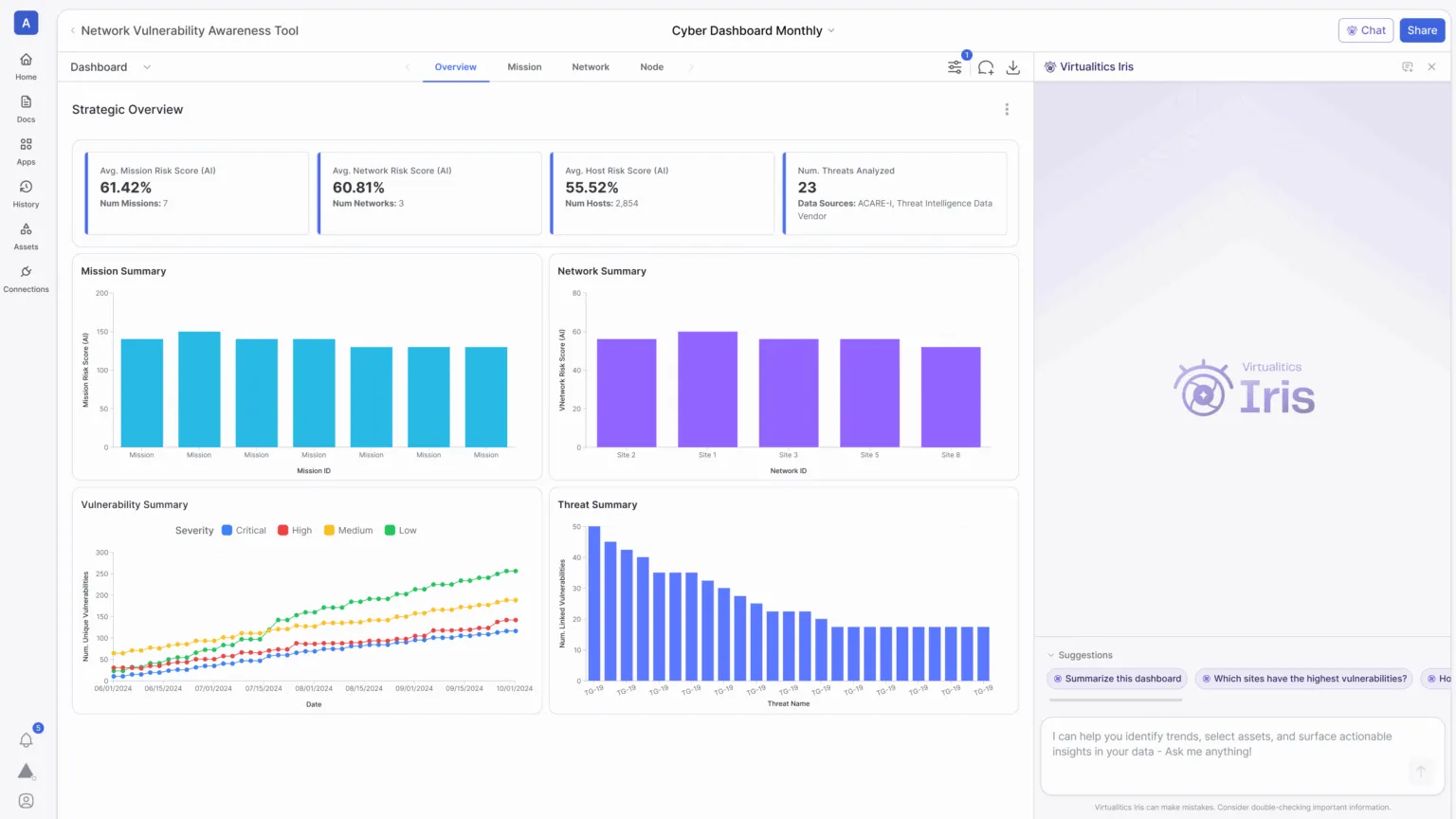 Virtualitics IRO Cyber empowers cybersecurity teams with AI decision intelligence to manage threats and prioritize risks across networks. It unifies vulnerability scans, threat intelligence feeds, and AI-powered assessments to deliver actionable insights. With features like asset criticality scoring, threat group identification, and host fingerprinting, IRO Cyber helps teams understand what’s about to fail, how to respond, and what-if scenarios to maintain security and availability.