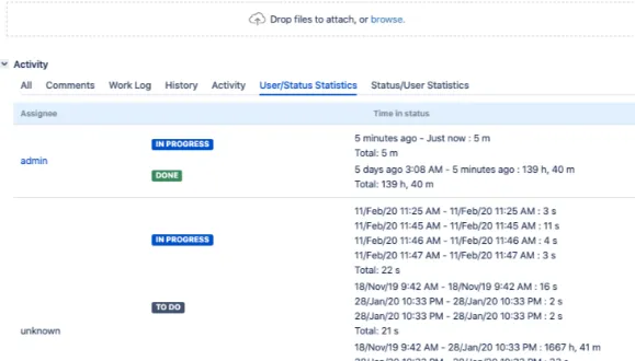 Leverage tabs with real time statistics by assignees and statuses and easily track how long the issue was in a certain status and who was working on it the most.