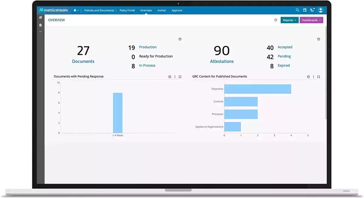 MetricStream's IT and Cyber Policy Management software streamlines the creation, communication, and management of IT policies. It centralizes policy documents, automates workflows, and enhances compliance tracking, providing complete visibility and improving governance across the enterprise.