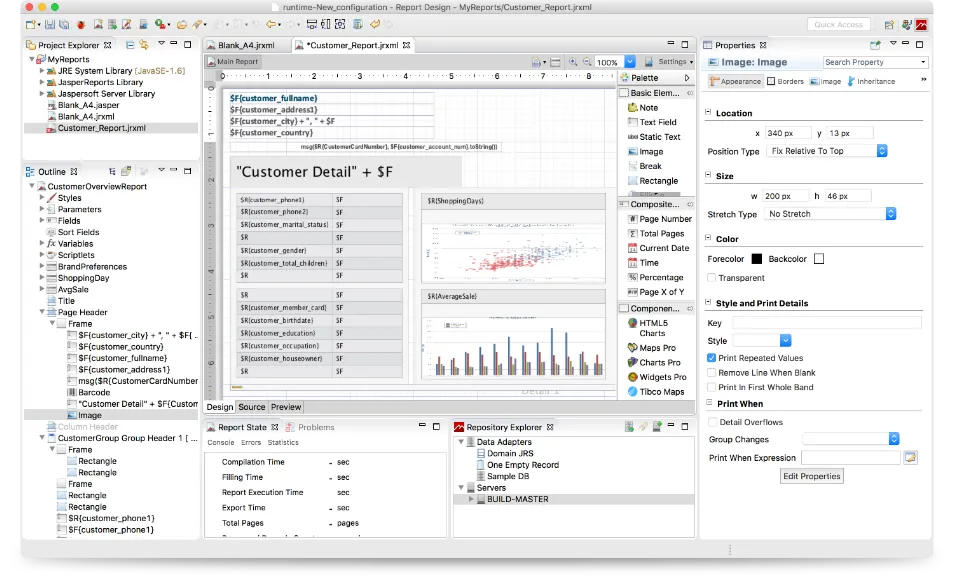 The industry’s most advanced design environment Jaspersoft Studio enables you to create highly formatted, pixel-perfect designed reports and data visualizations that meet any requirements and can pull from the widest selection of data sources. Whatever you create can be customized to support specific business requirements, re-used and easily published for distribution. The extensible architecture also allows developers to tap into libraries and functionality from third-party software.