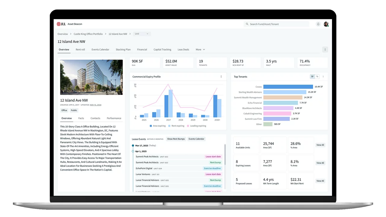 JLL Asset Beacon is an intelligent commercial real estate (CRE) asset management platform that consolidates operational, financial, and leasing data into one centralized hub. Designed for asset managers, it leverages AI-powered analytics to maximize returns, minimize risk, and streamline decision-making across entire property portfolios.