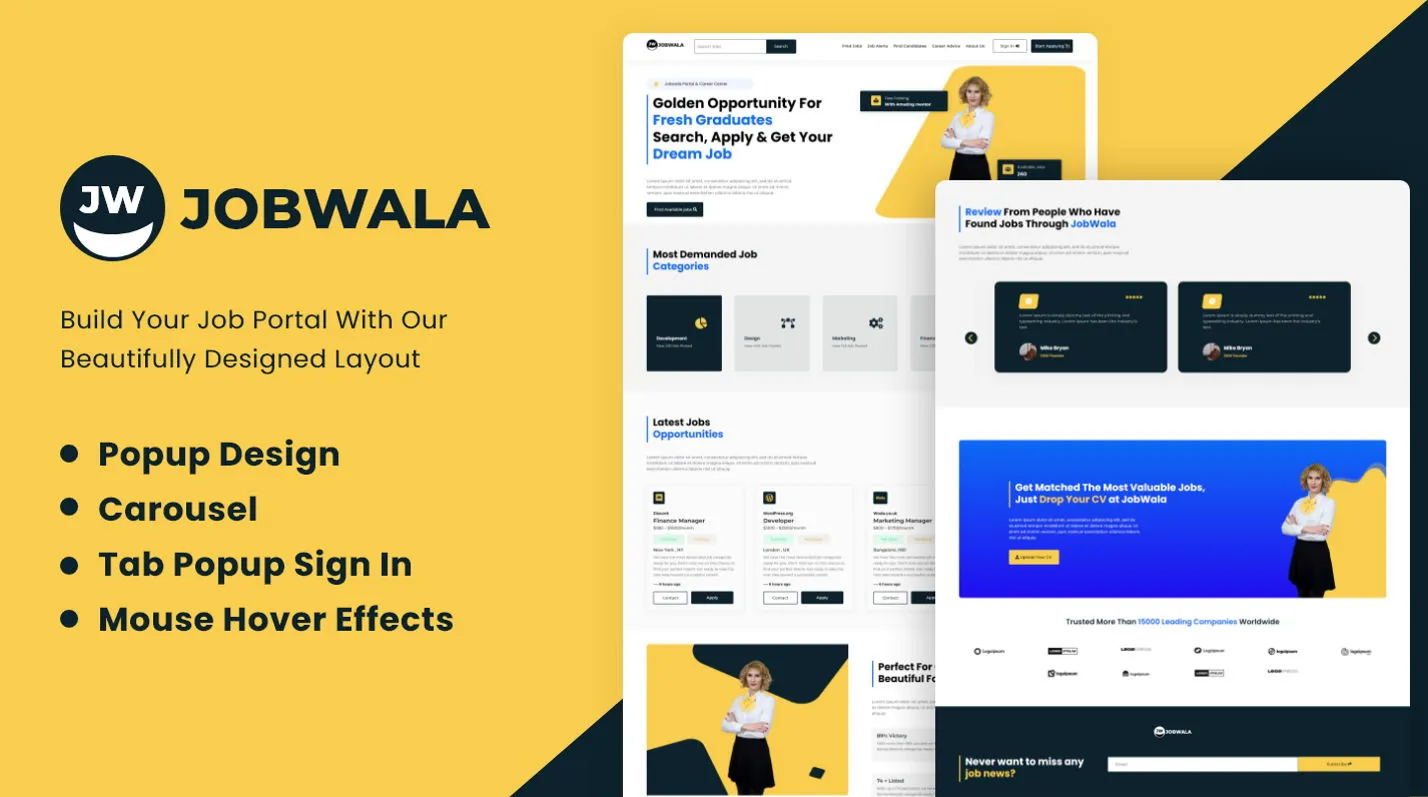 Jobwala is a Divi layout designed to create professional job board websites. It includes sections for job listings, categories, filters, and application forms. Perfect for HR agencies, recruiters, and company career pages, it offers a clean design and responsive layout. Easily customizable with Divi Builder, Jobwala helps streamline hiring and improve candidate experience.