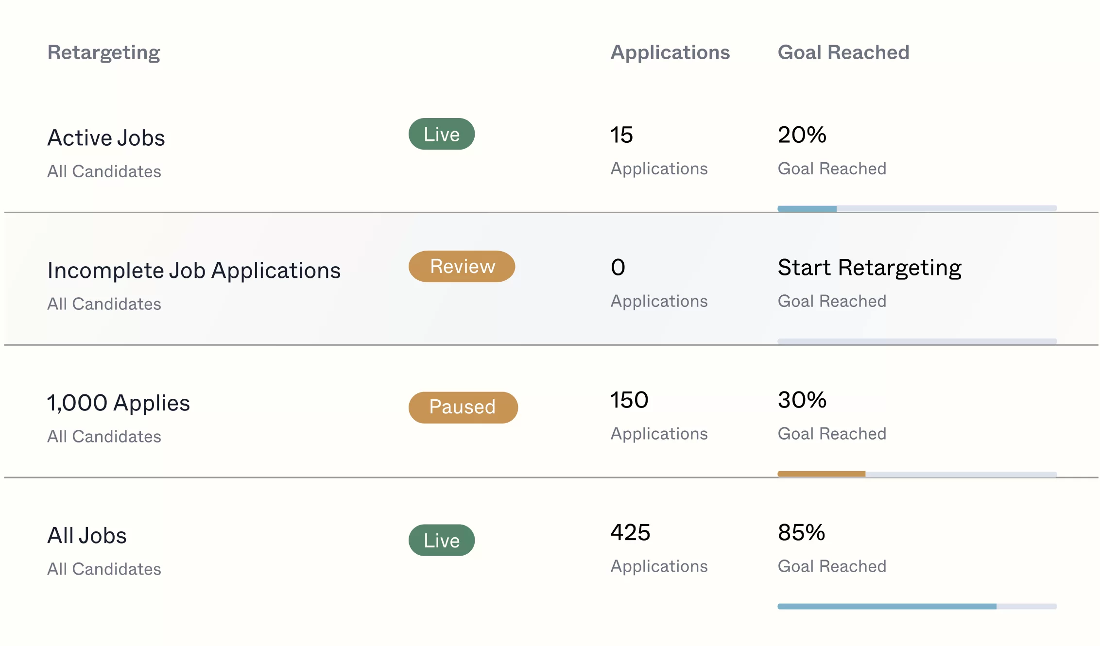 - Job-Level Targeting: Targets candidates with social, search, and display ads at an individual job level, offering greater specificity than campaign-level targeting.