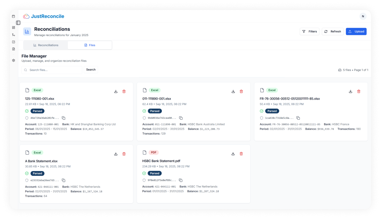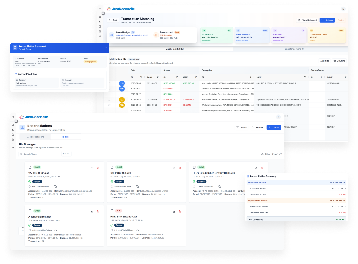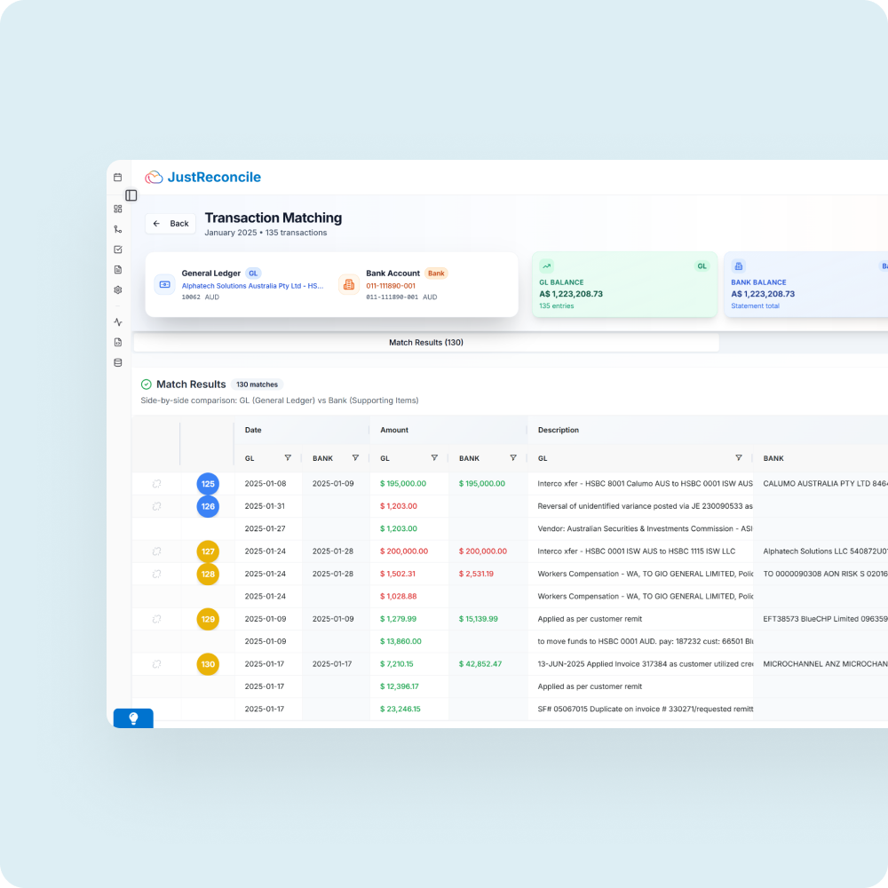 - Complete Automation: Handles reconciliations autonomously from start to finish with high-confidence matches and full transparency.