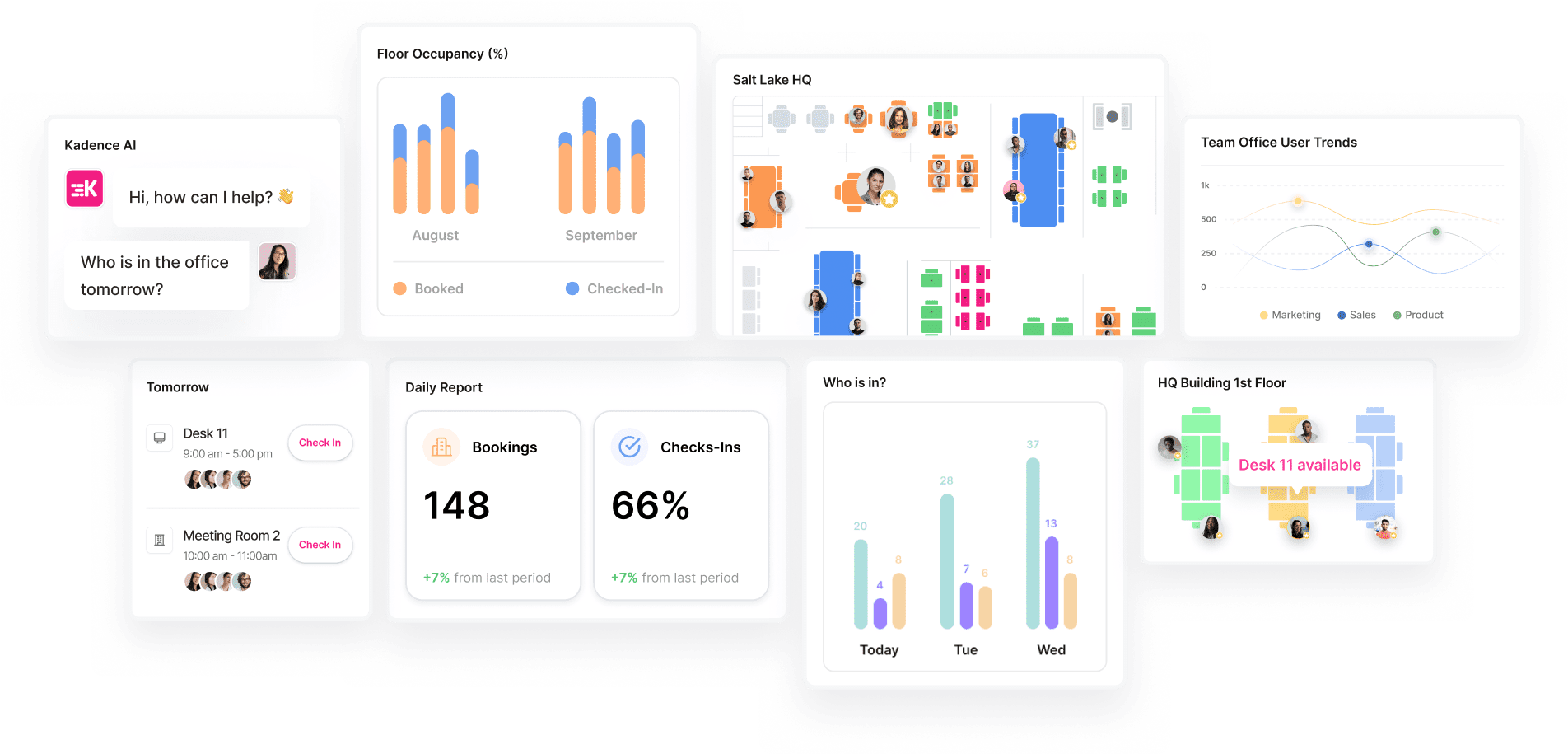 Kadence is a hybrid workplace management platform that helps organizations coordinate people, spaces, and schedules. It streamlines desk and room bookings, automates space planning, and enhances employee engagement through smart scheduling and seamless integrations.