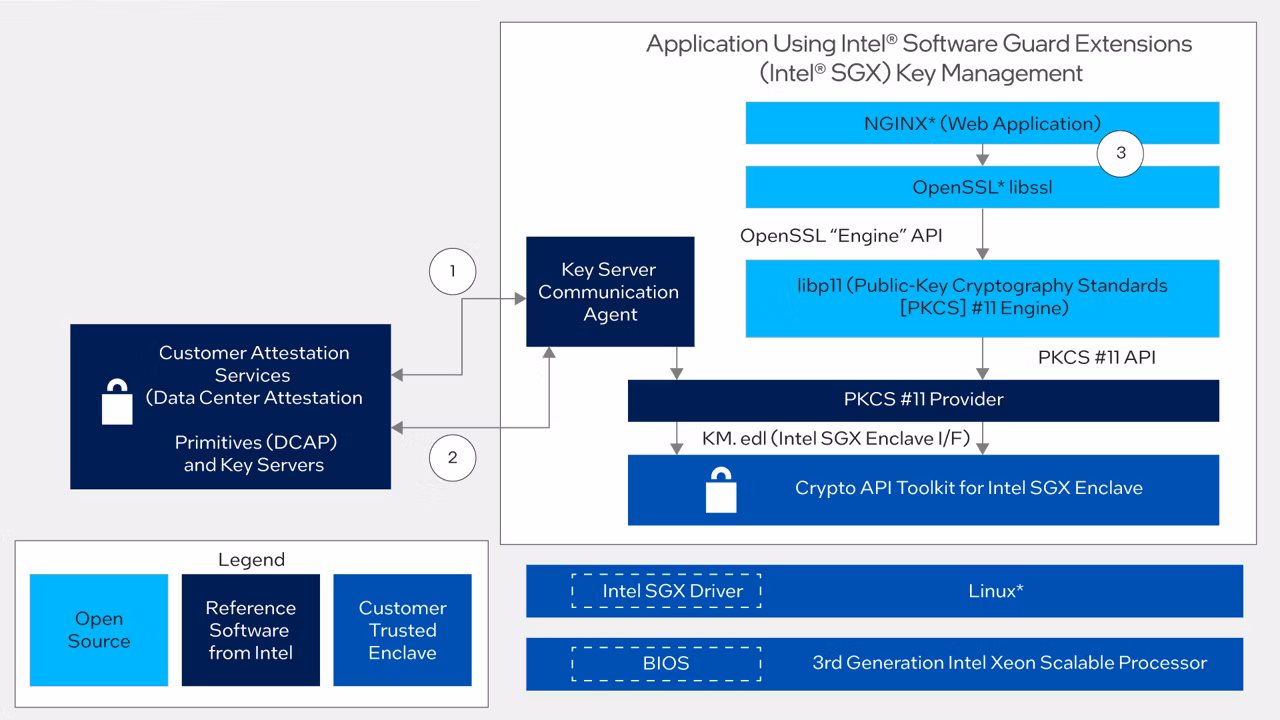 This reference software demonstrates how to integrate the asymmetric key capability in Intel® Software Guard Extensions (Intel® SGX) with a hardware security model (HSM) on a centralized key server. This reference application sets up an NGINX* workload to access the private key in an Intel SGX enclave on a 3rd generation Intel® Xeon® Scalable processor using: