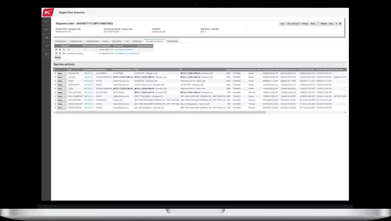 Kinaxis transportation management goes beyond "transportation," providing visibility, collaboration and optimization across the full order life cycle. Alongside traditional functions, like track and trace, Kinaxis provides AI-powered order planning and execution, so teams can consistently deliver the best service at the best cost – across multiple legs, modes, regions and parties – all on one platform. Visibility and collaboration across all transport modes Connect electronically or via portals with carriers, suppliers, partners and customers for visibility and collaboration across all transport modes (ocean, air, truck, rail and parcel). Flawless, cost-effective execution Ensure flawless, cost-effective execution via real-time alerts and in-app exceptions management, last-minute order and route changes to meet demands, and last mile delivery optimization. Real-time cost optimization Continuous, real-time cost optimization, along with dynamic invoice matching to ensure that actual execution and agreed service levels align.